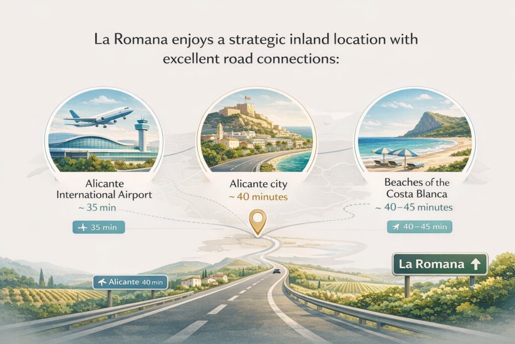 Surrounded by vineyards, almond trees and natural landscapes, La Romana offers tranquillity, space and a strong sense of community, while still providing easy access to Alicante city, the airport and the coast.